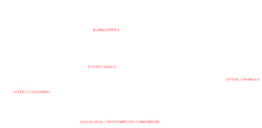 „Schlagzeug“ und „Geräusch“ überschneidet sich oft, manchmal geht „Geräusch“ auch in „Krach“ bzw. „Effekt“ über. Oft ist Tremolo dabei – da wedelt man wie verrückt mit der Bogenhand hin und her, danach hat man keine Kraft mehr.